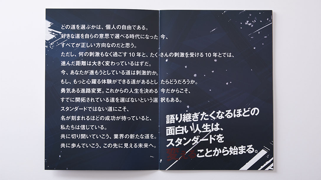 クライアントのブランド価値を体現する要素を追求する中で、同社の急成長のきっかけにもなった独自開発したマーケティング手法「Action Driven Marketing」に着目しました。私たちはこの考え方を、既存のAIDMA的志向と異なるこの手法は、すなわち“常識を変える”こと捉えたのです。そこで、「学生自身のこれからの人生」と関連付けて、「スタンダードを変える人生」というコアメッセージを開発。もはや安定など程遠い時代、いま何をするべきか?どんな人生を送りたいのか?を問いかけ、大手企業では真似することのできない刺激的な訴求を巻頭ページ見開きで展開しました。またお客様に貢献している事実を伝え、成長企業の裏付けとして信用性を感じさせる要素として、クライアントインタビューを掲載しました。これは、採用案内のパンフレットではあまり例の無いコンテンツですが、戦略的なセールスストーリーを構築して進めているからこそ生まれたアイデアです。さらに、既定路線を塗り変えていく様子は、モチーフとしてデザインにも落とし込んでいきました。コーポレートカラーの2色を取り入れ、会社の成長を感じさせるシズル感を演出しています。クライアントの持つ情熱や成長企業の威勢の良さをていねいに打ち出せたパンフレットとなりました。