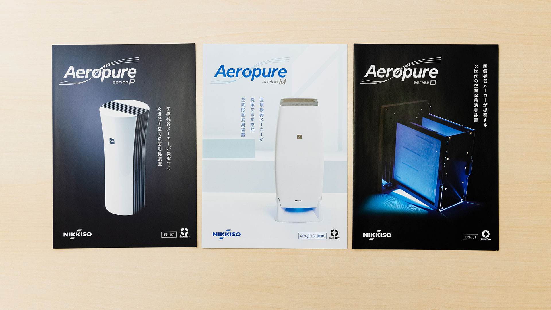 「日機装株式会社」は、ポンプ・システムや航空機部品、透析装置などの分野で高いシェアを誇る工業メーカーです。そんな日機装は、深紫外線LED搭載製品を提供するヘルスケア事業の拡大を狙っています。なかでも、とくに勢いづいていたプロジェクトが空間除菌消臭装置の「Aeropure」です。2020年の発売直後に新型コロナウイルスの感染拡大が重なったこともあり、当初の予想を大きく上回る売り上げを記録しました。その流れを受けて、日機装は「Aeropure」シリーズの広報活動や販売活動などを本格化するべく動き出したのですが、当時は社内制作の簡易的なパンフレットしかなく、製品の魅力を伝える訴求力に欠けていました。そこで、まずは「AeropureS」のパンフレットを刷新することに。さらに続けて、新製品となる「AeropureM」「AeropureP」「AeropureD」のパンフレットを制作することになりました。思いがけない需要拡大だったため、広報スケジュールや製品の発売スケジュールを加味しながら、パンフレット制作も急ピッチで進められました。宣伝用素材のストックも充分ではなかったので、一部の製品の撮影も担当しています。