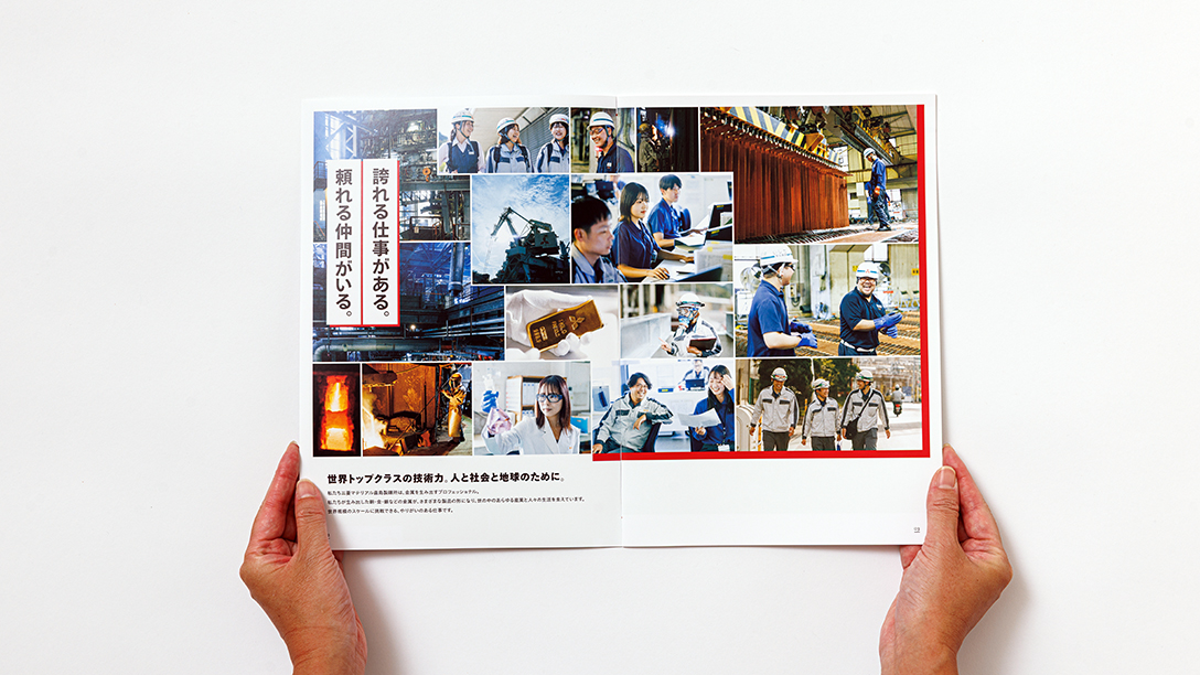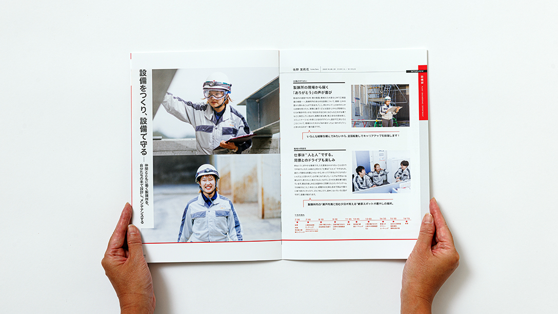 採用コンセプトの柱として「誇れる仕事がある。頼れる仲間がいる。」というメッセージを策定しました。提案段階から重視したデザイン戦略は、写真を大きく大胆に使用し、理屈よりも先に視覚的なインパクトで「働くイメージ」と「楽しそうな雰囲気」を直感させることです。完成したパンフレットでは、直島の美しい夕景や巨大なプラント、そして真剣な眼差しで作業する社員の表情をドラマチックに切り取り、世界トップクラスの技術を支える仕事のスケール感を表現しました。同時に、先輩社員のインタビューページを充実させ、オンの厳しさとオフ(寮生活や部活動)の温かさのギャップを丁寧に描写。パンフレットだけでなく、ポスターやチラシ、映像制作までトータルでデザインを手掛けることで、すべてのタッチポイントにおいて「前向きで活発、規律を守れる、元気が良く誠実」という求める人物像と企業風土がリンクするよう、一貫したトーン&マナーで世界観を統一しました。
