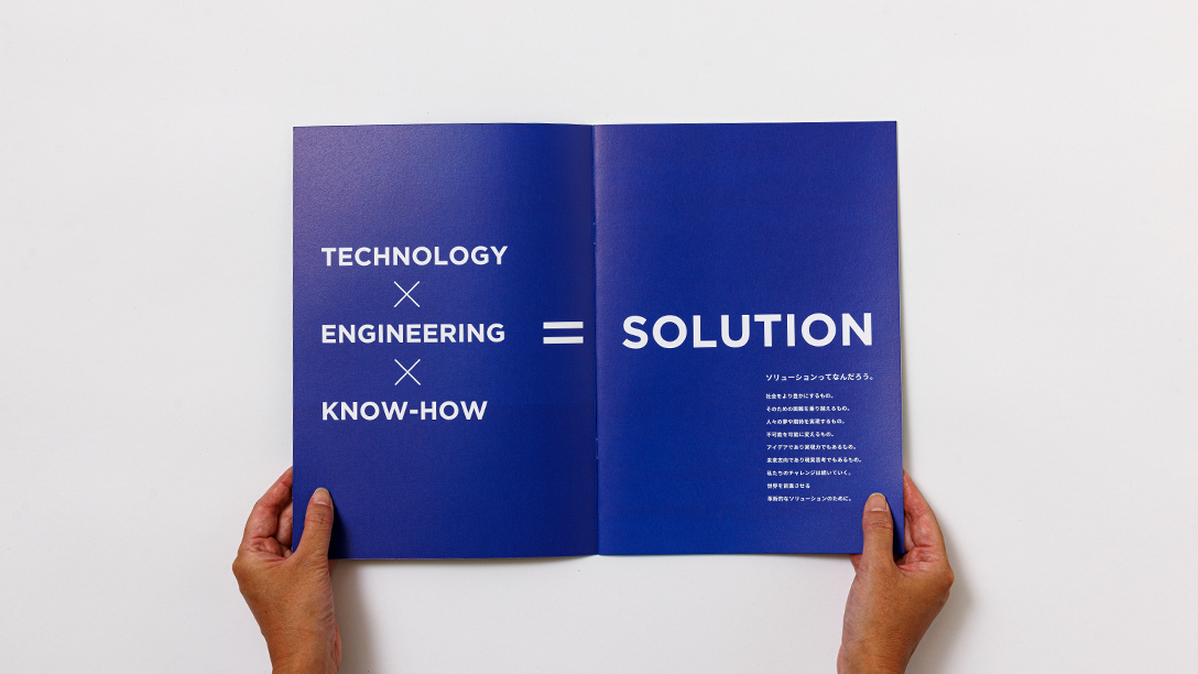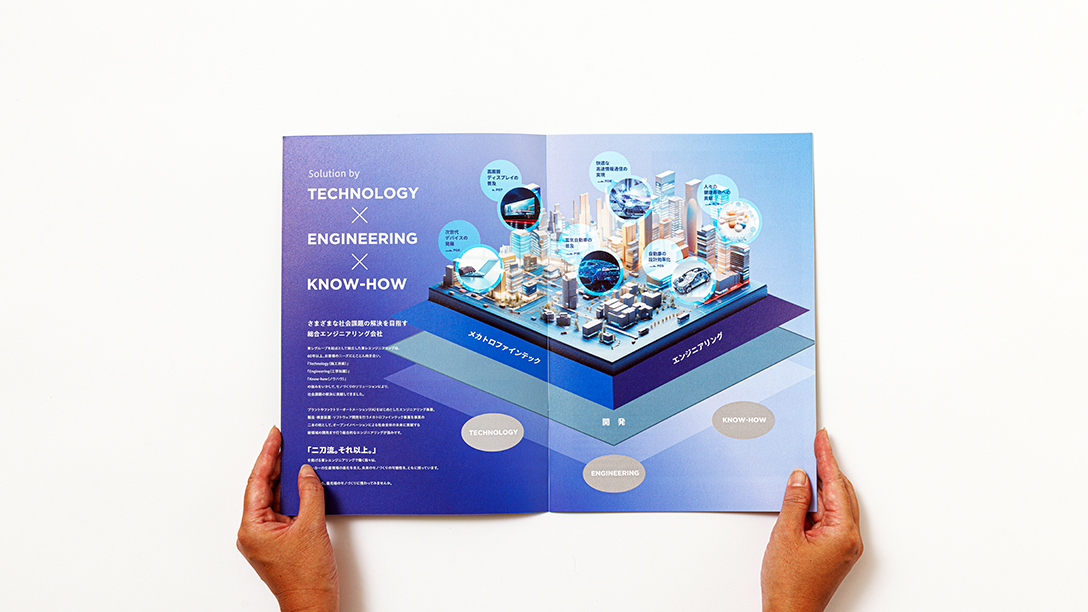 表紙から巻頭にかけては、「Solution」というキーワードをあえてもう一度問い直す「ソリューションってなんだろう」というキャッチコピーと、未来の都市像やデジタル社会を象徴する緻密なグラフィックを展開。視覚的なインパクトを重視したデザインワークにより、「世界を変える原動力」としての企業のスケール感と、「世界のモノづくりをUPDATEする」という強い意志を直感的に訴求しました。