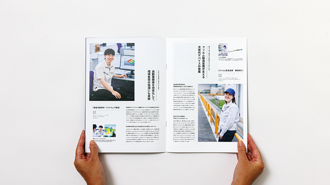 この課題に対し、私たちは一般的な職種紹介の枠を超え、社員一人ひとりの「人」と「語り」に徹底してフォーカスした誌面構成で解決を図りました。まるで写真集のような空気感のあるビジュアルを採用し、若手社員が日々直面する技術的挑戦や、その先にある社会貢献(EV普及、医療、半導体不足の解消など)への想いを飾らない言葉で綴ることで、読み手が「仕事の手触り感」と「社会的意義」を同時に理解できるストーリーを構築しました。また、滋賀という拠点についても、没入して研究・開発に打ち込める「ピュアな環境」としてポジティブに表現しています。