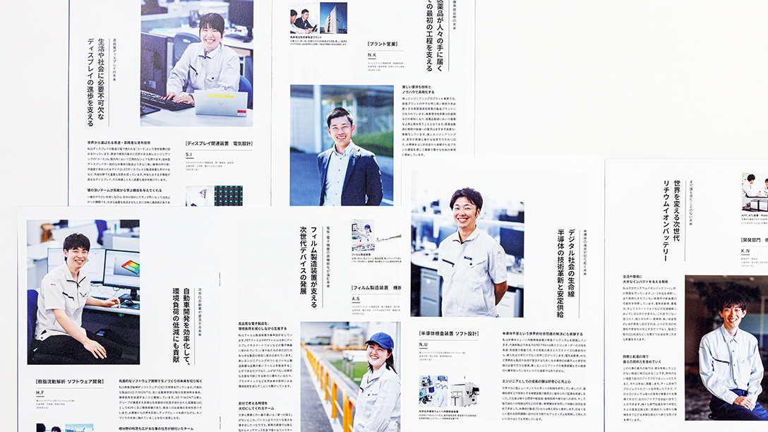 新卒向け採用案内パンフレットのデザイン制作において、BtoB事業特有の「仕事内容の具体像や社会への影響力が学生に伝わりにくい」という点に課題がありました。単に会社概要や装置画像を羅列するだけでは、「ソリューションで世界を変えていく」という同社のダイナミズムや、実際にそこで働く自身の姿を学生が直感的にイメージすることが困難だったためです。また、東京・大阪・名古屋などの大都市圏に拠点を置く競業企業との差別化を図る新しい文脈づくりも必要でした。